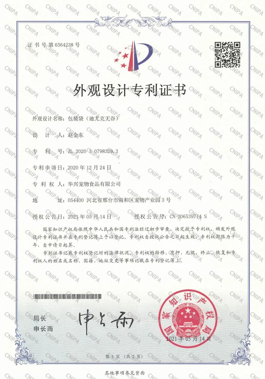 近日,國(guó)家知識(shí)產(chǎn)權(quán)局依照中華人民共和國(guó)專利法經(jīng)過初步審查,授予迪尤克無谷包裝袋外觀設(shè)計(jì)專利證書,專利號(hào):ZL 2020 3 0798329.3,并在專利登記薄予以登記。